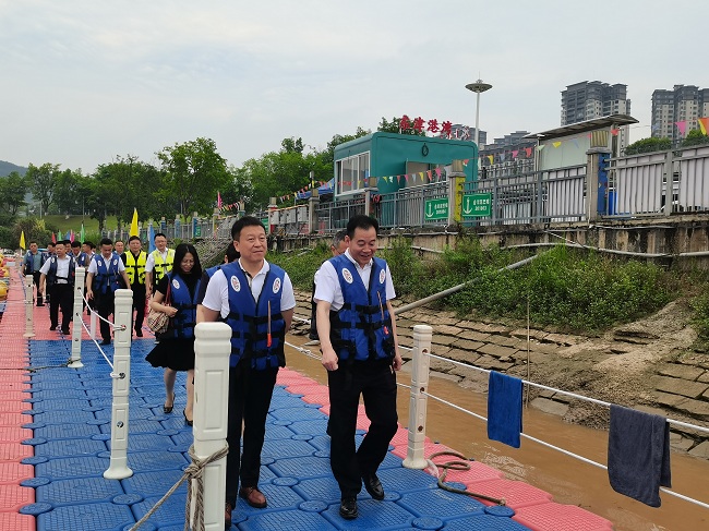 6月7日上午,南充市委常委、市政府常务副市长黄志权一行到合川游船公司考察调研水上运动项目,重轮集团党委书记、董事长苗浩野,党委委员、副总经理雷霖,合川游船公司负责人陪同。黄市长一行对东津沱码头现场水上运动项目进行了查看并详细了解,并乘座体验快艇项目,随后在“交运钓鱼城”游船二楼多功能厅召开了水上运动项目考察调研座谈会。