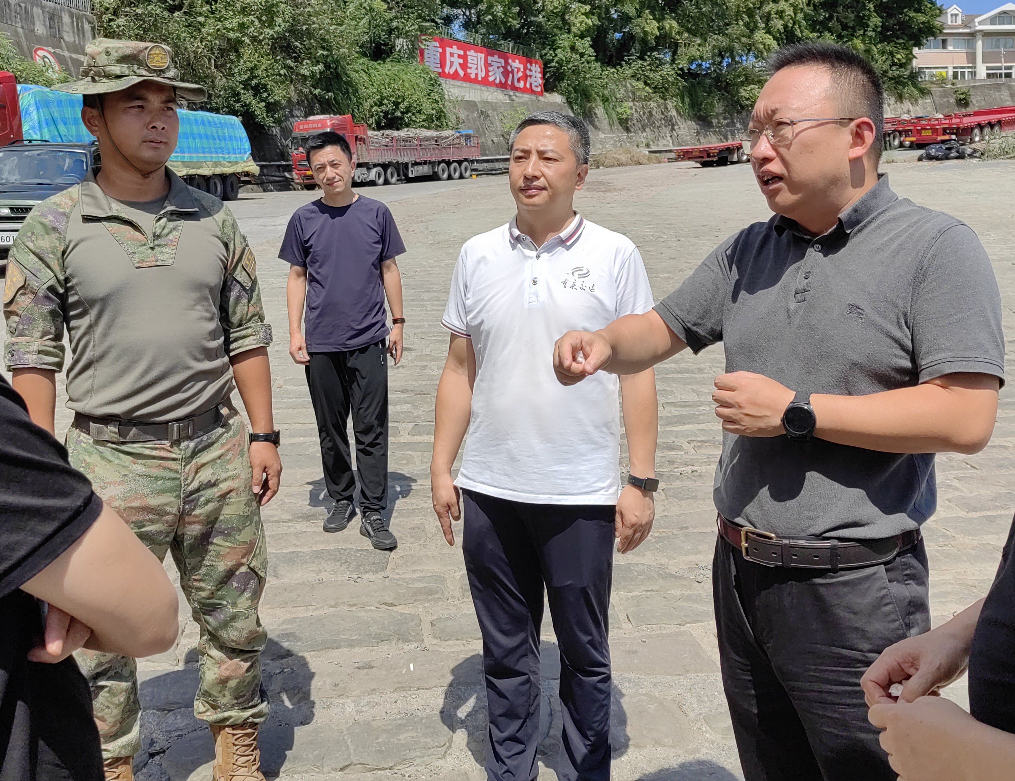 8月25日下午,重庆市交委国防交通运输处、市港航中心运输处、港口处和驻渝某部一行到郭家沱港开展军地联合演练现场调研。