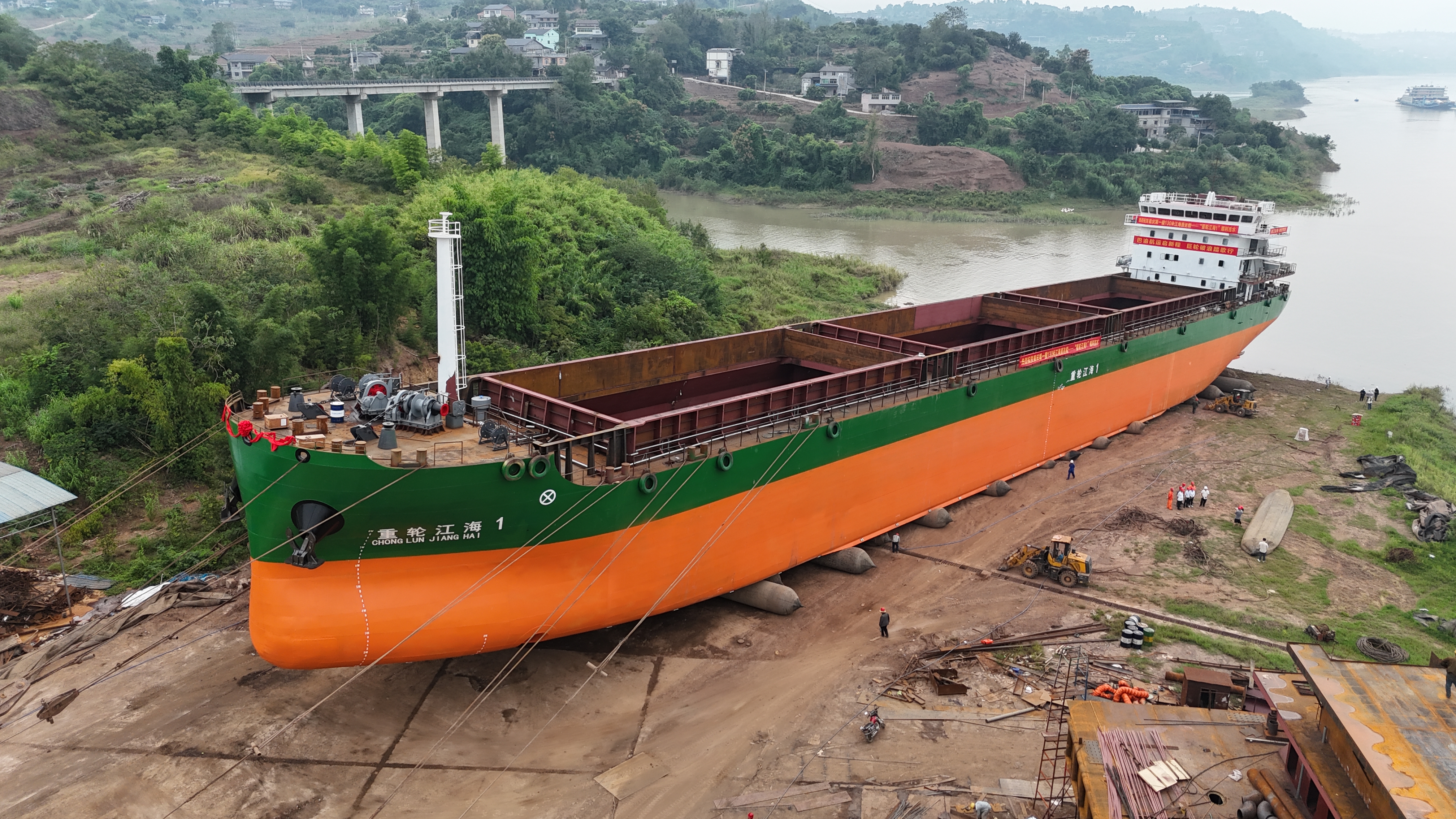 9月30日11时18分,重庆第一艘130米江海直达船 ——“重轮江海1”在重轮集团中江船业有限公司顺利吉水,这标志着重轮集团在构建江海直达综合运输体系的征程上迈出了具有里程碑意义的一步,也是深入贯彻落实国家交通强国战略、服务长江经济带高质量发展的生动实践。“重轮江海1”的设计与建造,以习近平生态文明思想为指引,始终将绿色发展理念贯穿每个环节。该船积极推行技术创新,突破性采用单一LNG 动力技术,较传统船舶可减少20%以上的碳排放,以科技创新推动航运业绿色转型。预计“重轮江海1”11 月正式投入“重庆—舟山”航线运营,届时将有效提升我市大宗物资物流效率、降低社会综合物流成本、赋能沿江产业经济高质量发展。