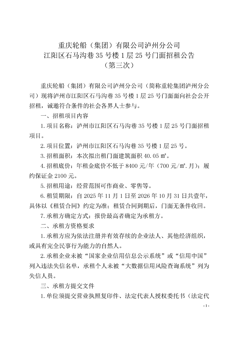 泸州分公司江阳区石马沟巷35号楼1层25号门面招租公告(第三次)