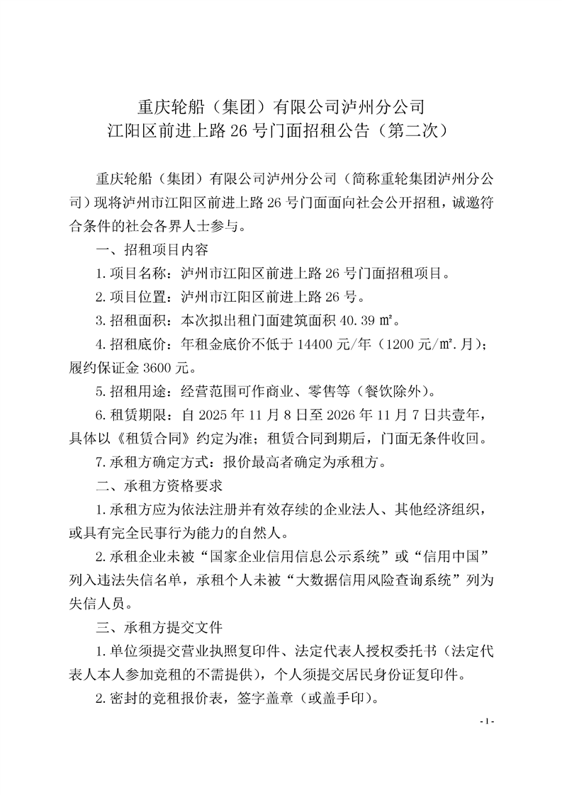 泸州分公司江阳区前进上路26号门面招租公告(第二次)