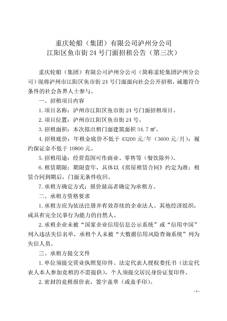 泸州分公司江阳区鱼市街24号门面招租公告(第三次)