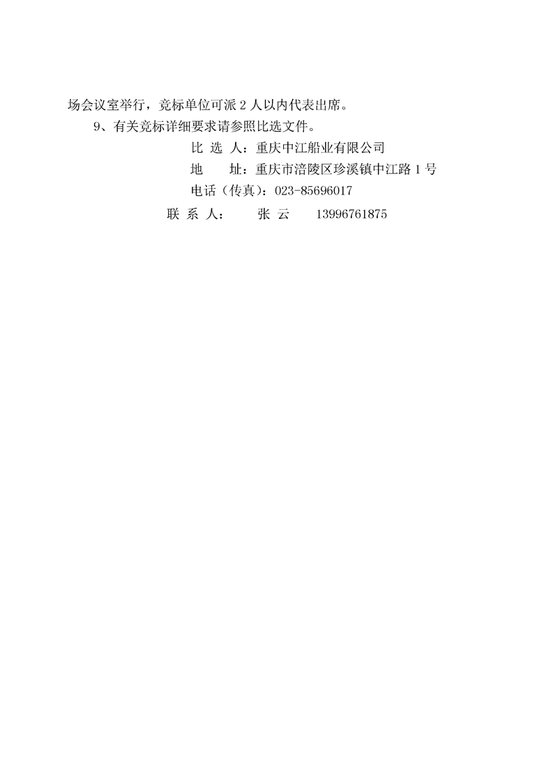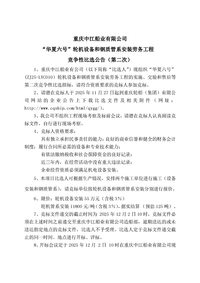 重庆中江船业有限公司 “华夏六号”轮机设备和钢质管系安装劳务工程 竞争性比选公告(第二次)