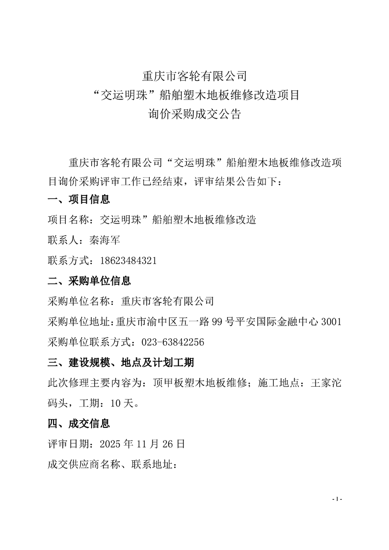 重庆市客轮有限公司“交运明珠”船舶塑木地板维修改造项目询价采购成交公告