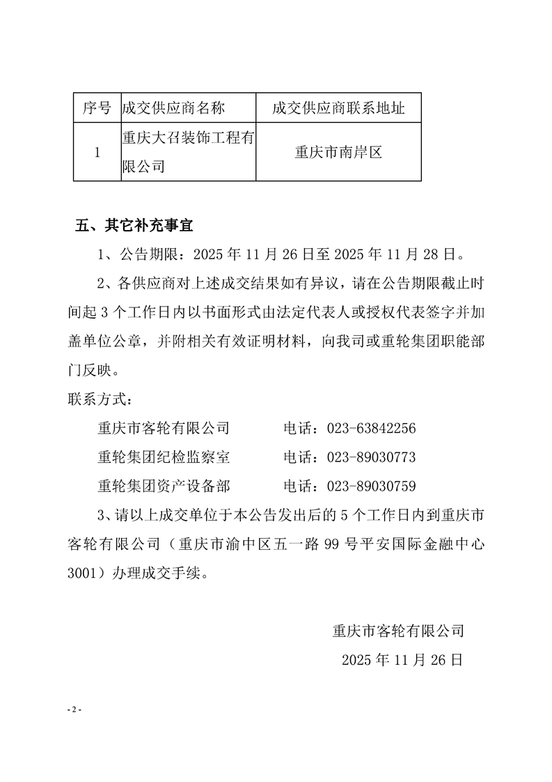 重庆市客轮有限公司“交运满江红”船舶油漆涂装项目询价采购成交公告