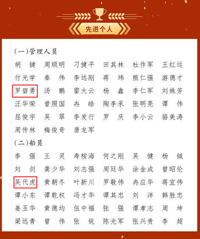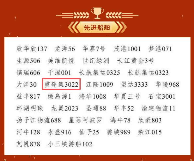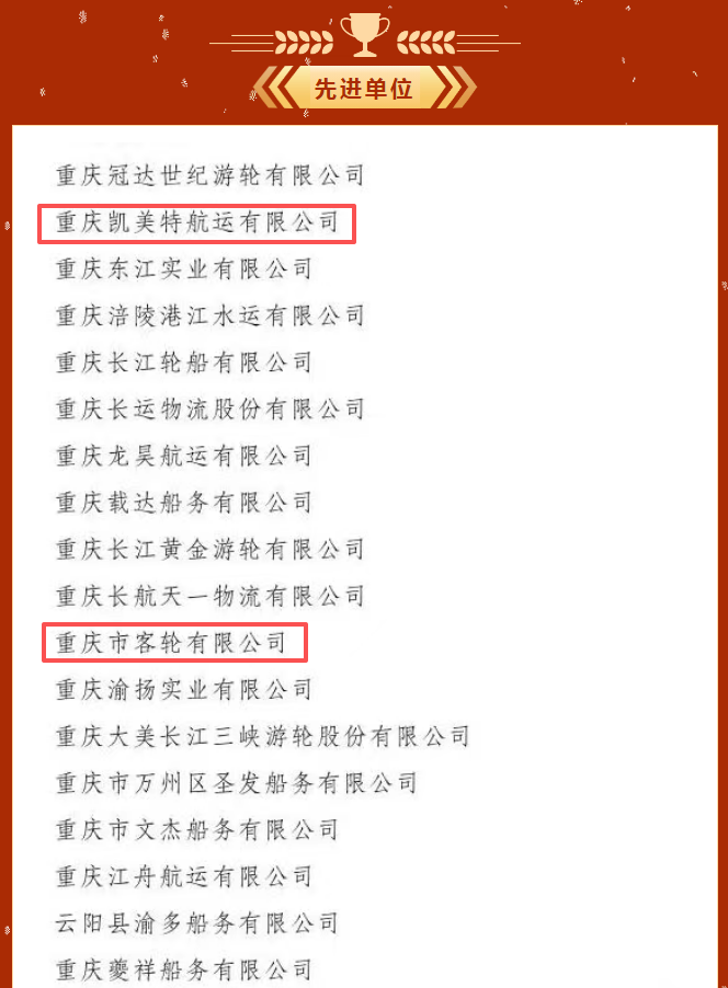为表彰先进、树立标杆,激励全体航运企业和从业人员凝心聚力再奋进,经重庆海事局研究决定,授予重庆凯美特航运有限公司、重庆市客轮有限公司等18家单位“2024年度水上交通安全先进单位”称号,授予“重轮集3022”等39艘船舶“2024年度水上交通安全先进船舶”称号,授予罗碧勇、吴代虎等70名个人“2024年度水上交通安全先进个人”称号!
