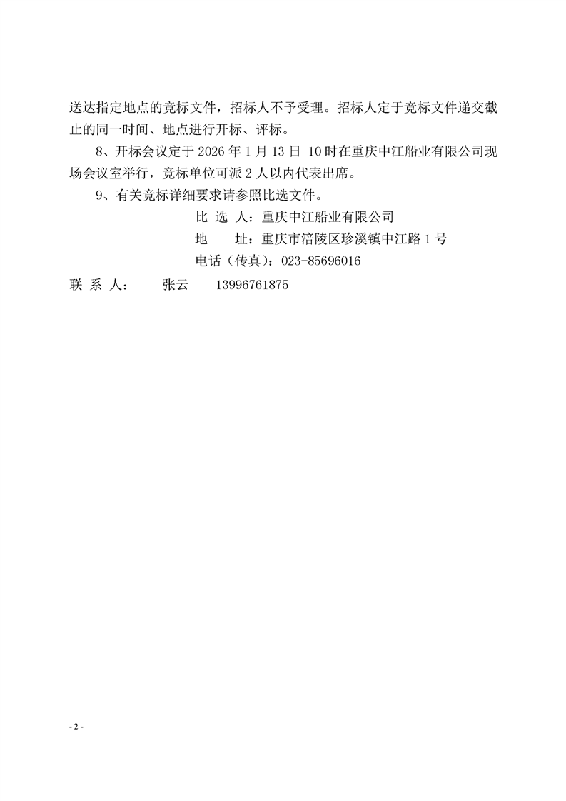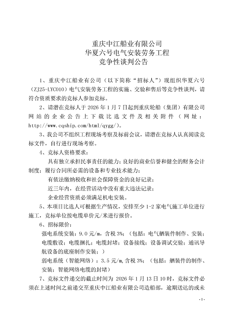 重庆中江船业有限公司华夏六号电气安装劳务工程竞争性谈判公告