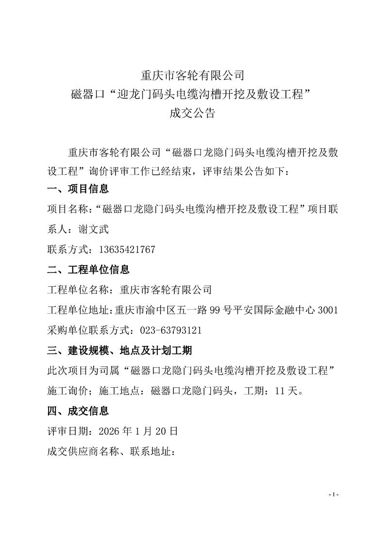 重庆市客轮有限公司磁器口“迎龙门码头电缆沟槽开挖及敷设工程”成交公告