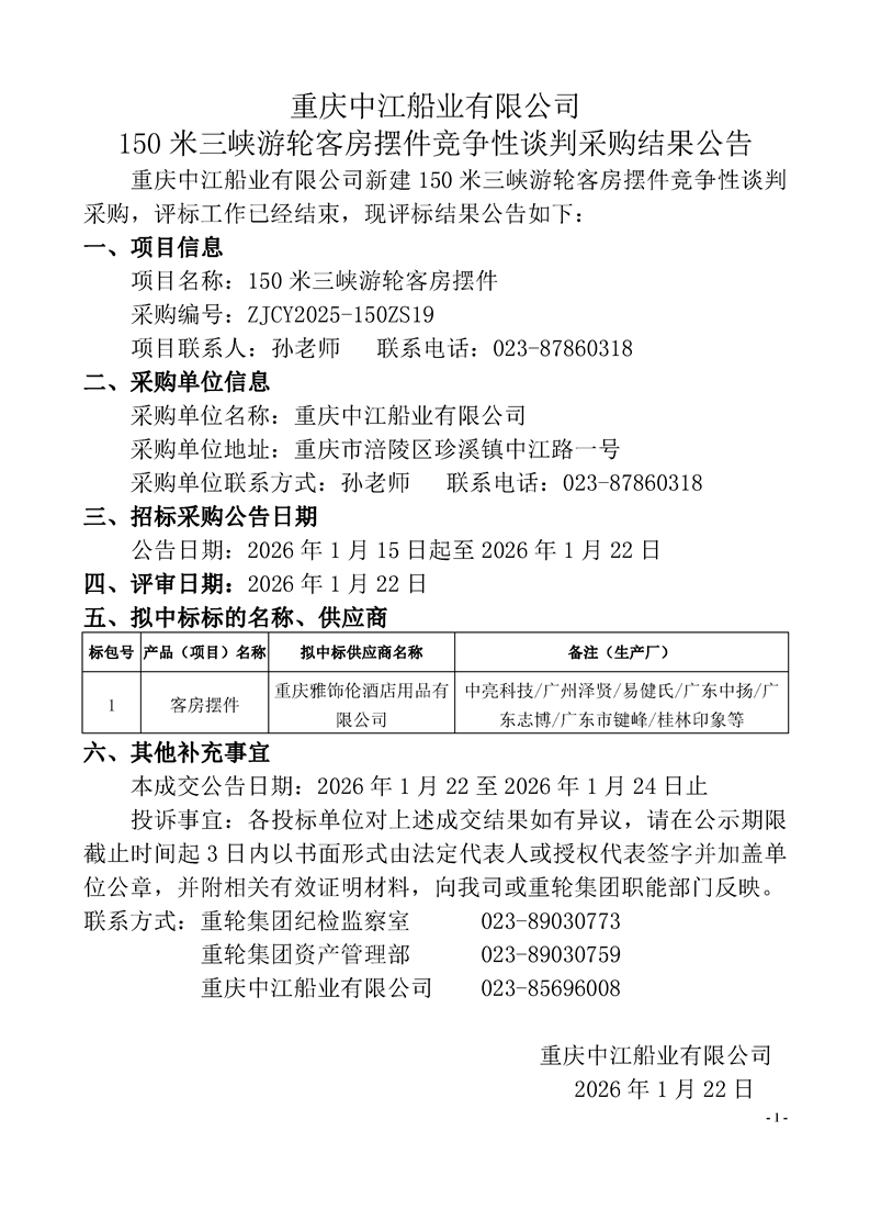 中江船业150米三峡游轮客房摆件竞争性谈判采购结果公告(采购编号:ZJCY2025-150ZS19)