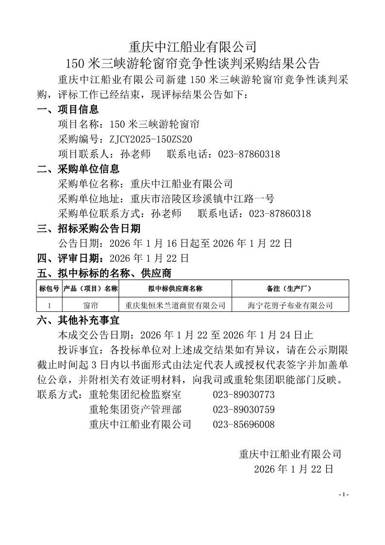 中江船业150米三峡游轮窗帘竞争性谈判采购结果公告(采购编号:ZJCY2025-150ZS20)