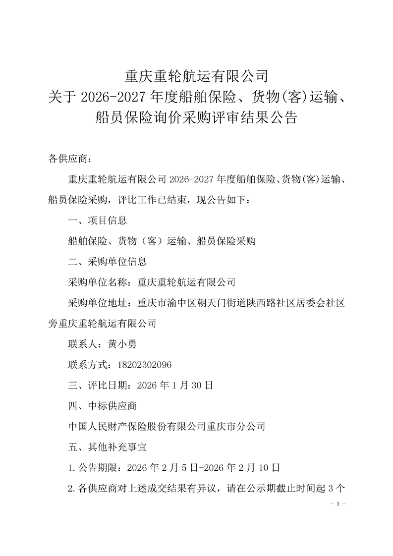 重庆重轮航运有限公司关于2026-2027年度船舶保险、货物客运输、船员保险询价采购评审结果公告