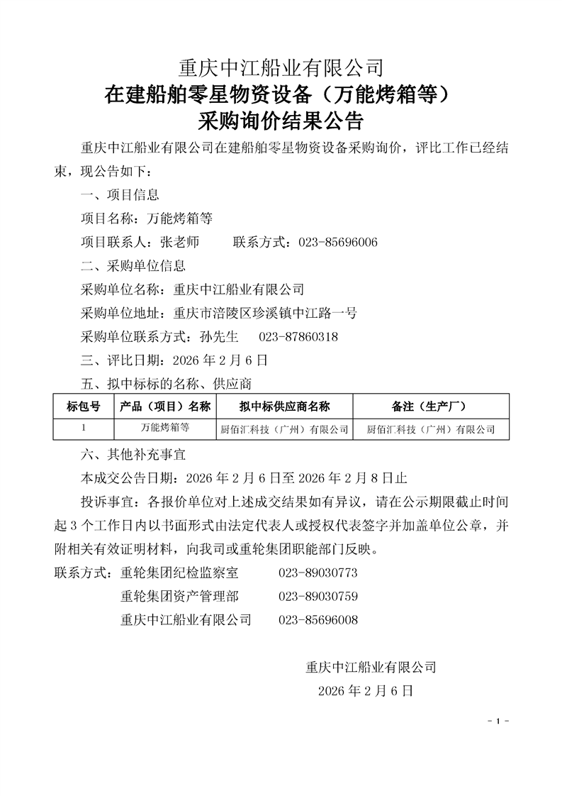 中江船业在建船舶零星物资设备(万能烤箱等)采购询价结果公告