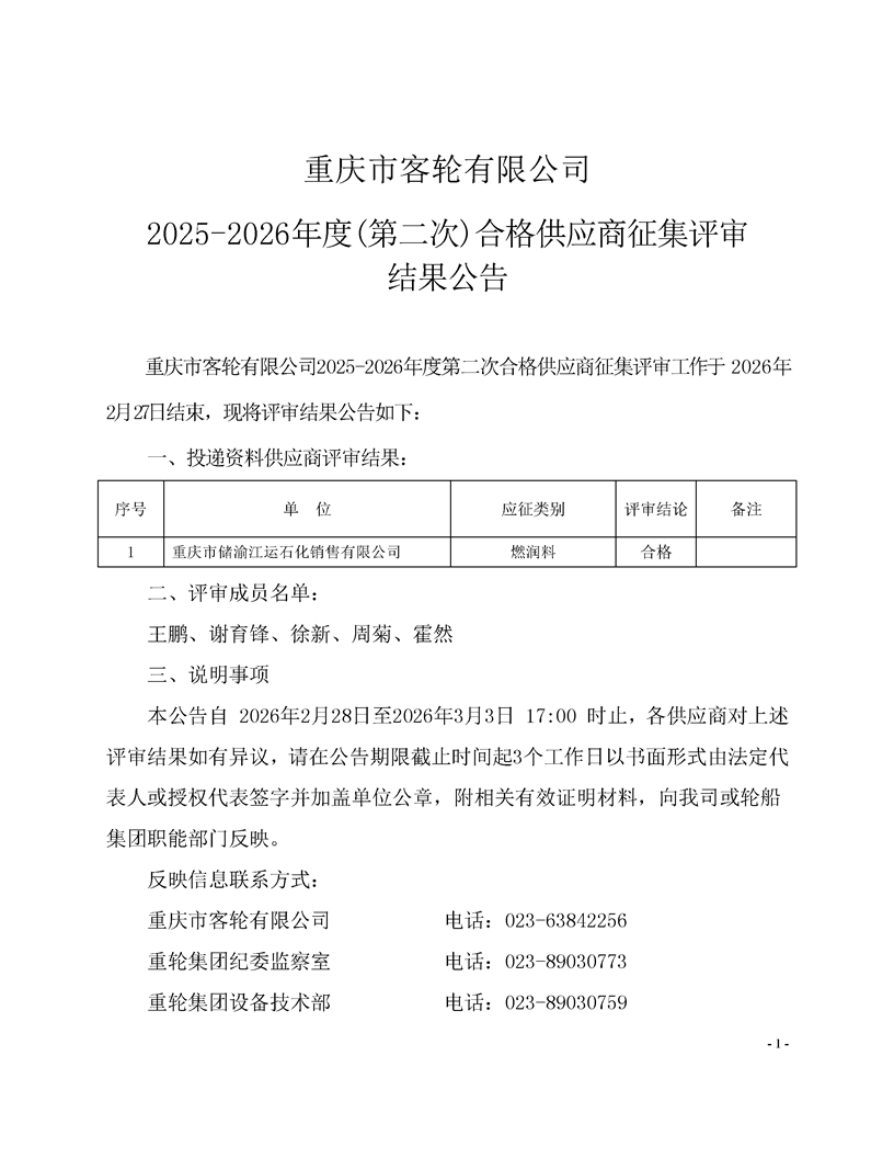 客轮公司2025-2026年度第二次合格供应商征集评审结果公告