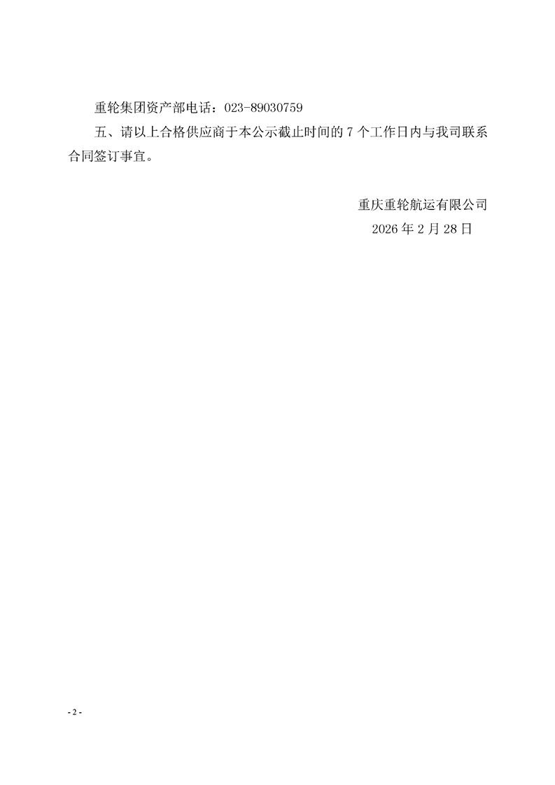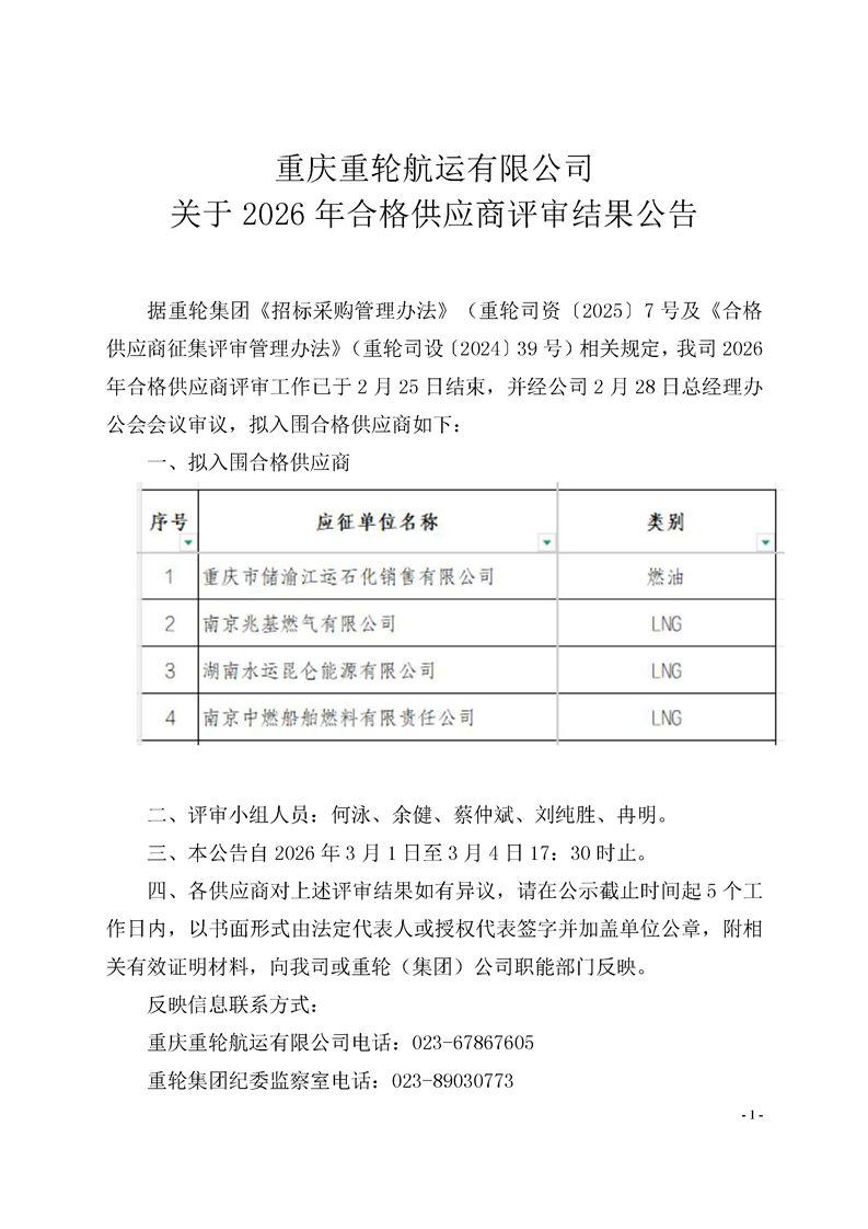 重庆重轮航运有限公司关于2026年合格供应商评审结果公告