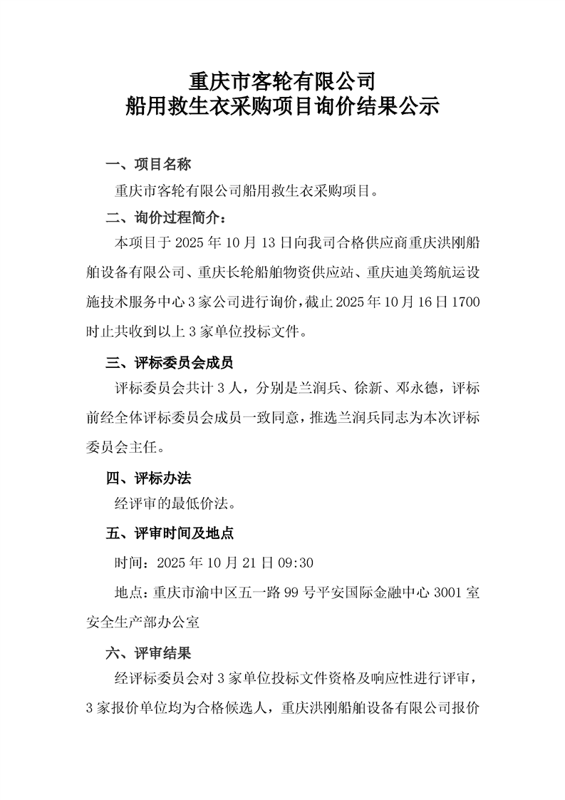 船用救生衣采购项目询价结果公示
