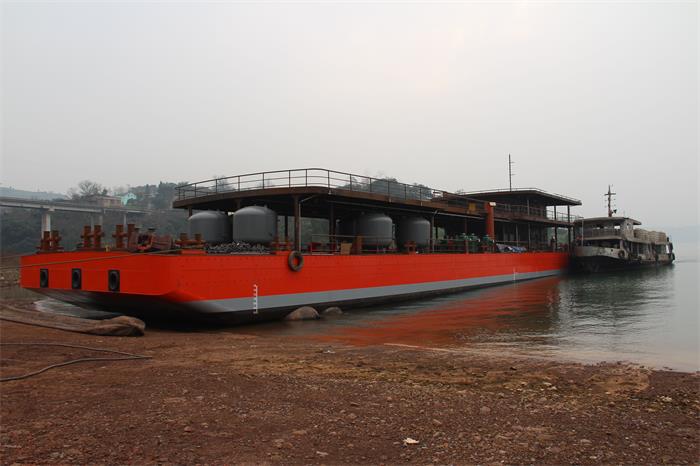 2018年1月29日上午10点38分,中江船业公司为重庆川维物流有限公司建造的75m川维趸船顺利完成下排,拖带至702趸靠泊。据悉,该船为单底单甲板箱型钢结构船,主甲板为强力甲板,主船体结构为全电焊混合骨架式,主甲板和船底采用纵骨架式。其船长75m,水线长73.18m,型宽13m,型深3m,设计吃水1.15m,结构吃水1.2m。航区为内河B级航区、J2级航段,主要用于停靠“3500t级标准型液货船“装、卸货物作业。(中江船业公司)