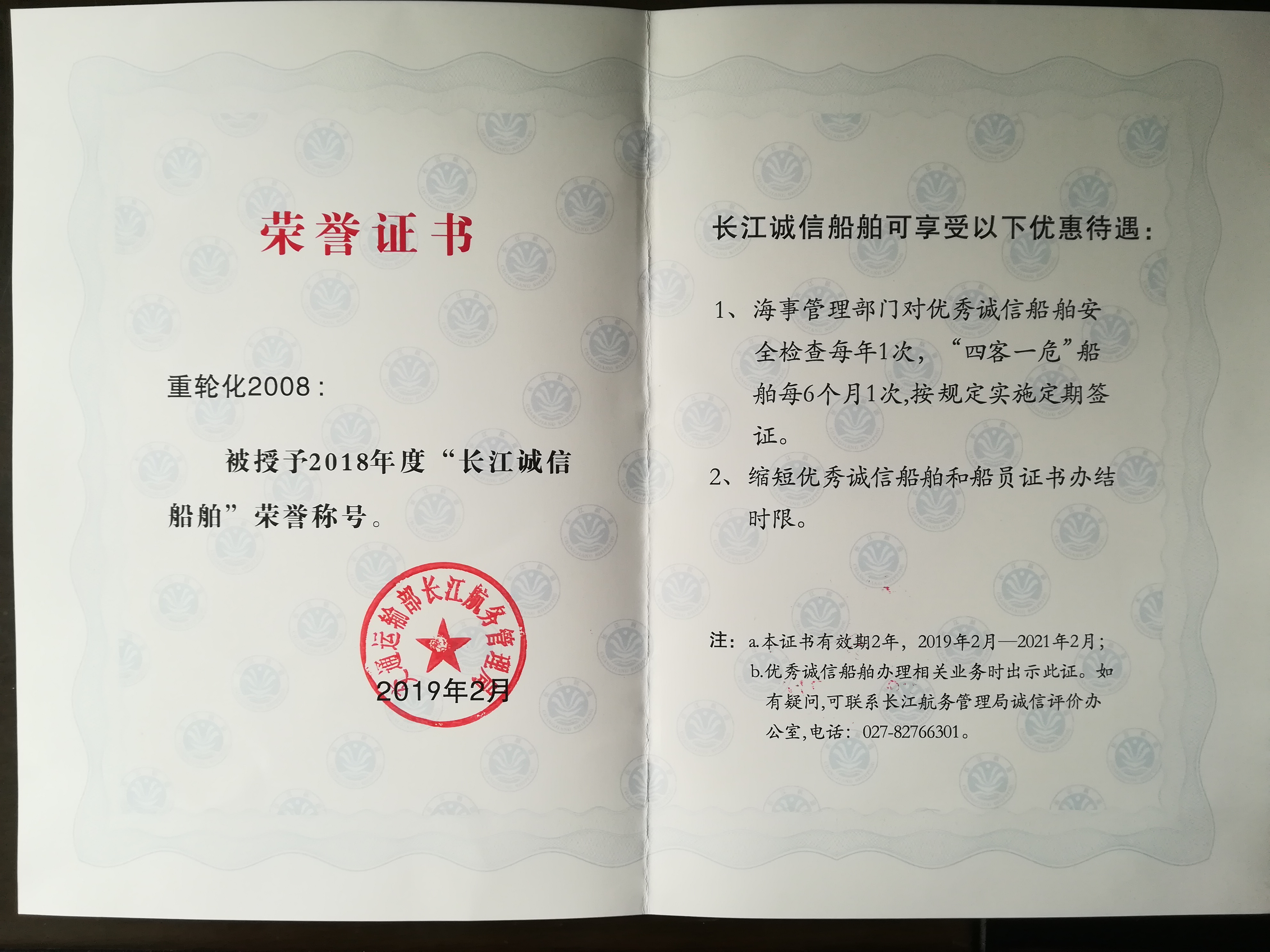 近日,交通运输部长江航务管理局授予重庆凯美特航运有限公司重轮化2008轮2018年度“长江诚信船舶”称号,本次长江航务管理局共评选出4艘“长江诚信船舶”,重轮化2008轮系长江内河危险化学品运输唯一一艘获此殊荣的船舶。