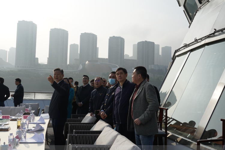 10月22日上午,重庆市副市长陆克华,副秘书长岳顺等一行乘坐“交运明月”轮开展朝天门至广阳岛生态观光航线及两岸环境综合整治检查工作,并在船上召开相关会议。渝中区、江北区、南岸区政府、市交通局、水利局、海事局等相关负责人参会,交运集团总经理曾勇、重轮集团总经理苗浩野陪同检查。