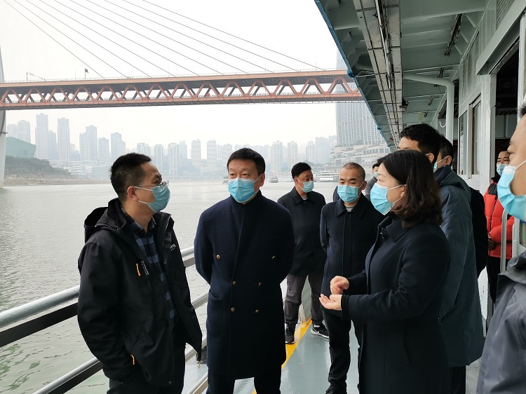 1月14日上午,重庆市交通局运输处调研员雷光材一行到客轮公司洪崖洞码头开展春节节前检查工作,重轮集团董事长苗浩野陪同检查。