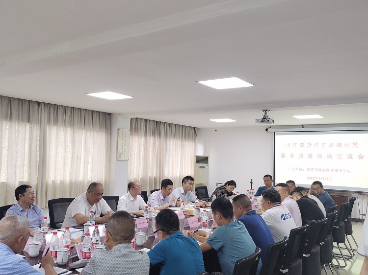 2022年6月21日,重庆市港航海事事务中心在郭家沱港埠公司会议室组织召开川江载货汽车滚装运输服务质量交流会。会议由市港航事务中心副主任刘良平主持,相关区县港航事务中心、港口及船运企业参加。