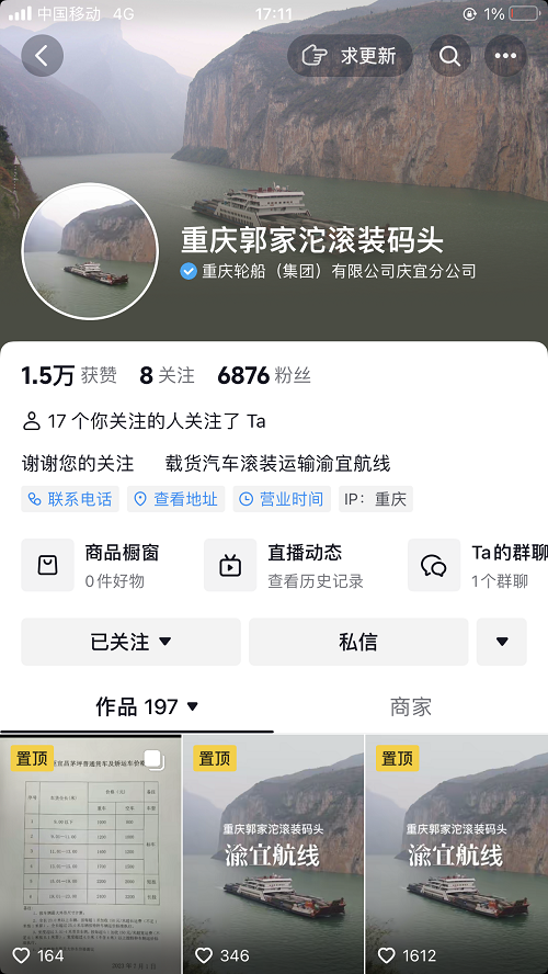 11月17日上午,庆宜分公司筹备已久的“重庆郭家沱滚装码头”抖音号真人上线直播正式开播,通过近两个小时的真人直播互动,平台曝光量6461次,进入直播间人数2250人次,点赞6.1万人次,参与互动评论1000次。下一步,庆宜分公司还将借助抖音直播平台,开展直播带货服务,为乘船客户提供货车机油、轮胎、篷布等日常用品,为客户提供一站式增值服务,持续提升川江载货汽车滚装运输渝宜航线服务水平和品牌影响力。