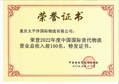 近日,在2023年度中国国际货代物流行业发展论坛期间,中国国际货运代理协会发布了2022年度中国国际货代物流行业发展蓝皮书暨2022年度中国国际货代物流行业数据。太平洋物流公司再次荣获中国国际货代物流营业总收入前100名,是重庆市仅有的两家上榜企业之一。