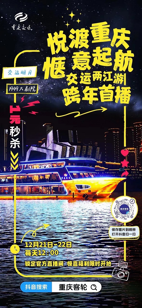 12月21日上午,客轮公司“悦渡重庆·惬意起航——交运两江游跨年首播”抖音直播活动在洪崖洞客运码头成功举行。此次直播共计开展两天,累计观看人数8157人次、平台曝光量12.4万次、成交订单量987单、累计成交金额28.6万元,直播期间登上重庆地区团购带货榜第三名。客轮公司在直播间推出了新春美食套餐、船票+景点套票等10余个特色产品,同时为惠及广大市民和游客朋友,还特别推出特价船票秒杀活动,直播间互动氛围热烈活跃。