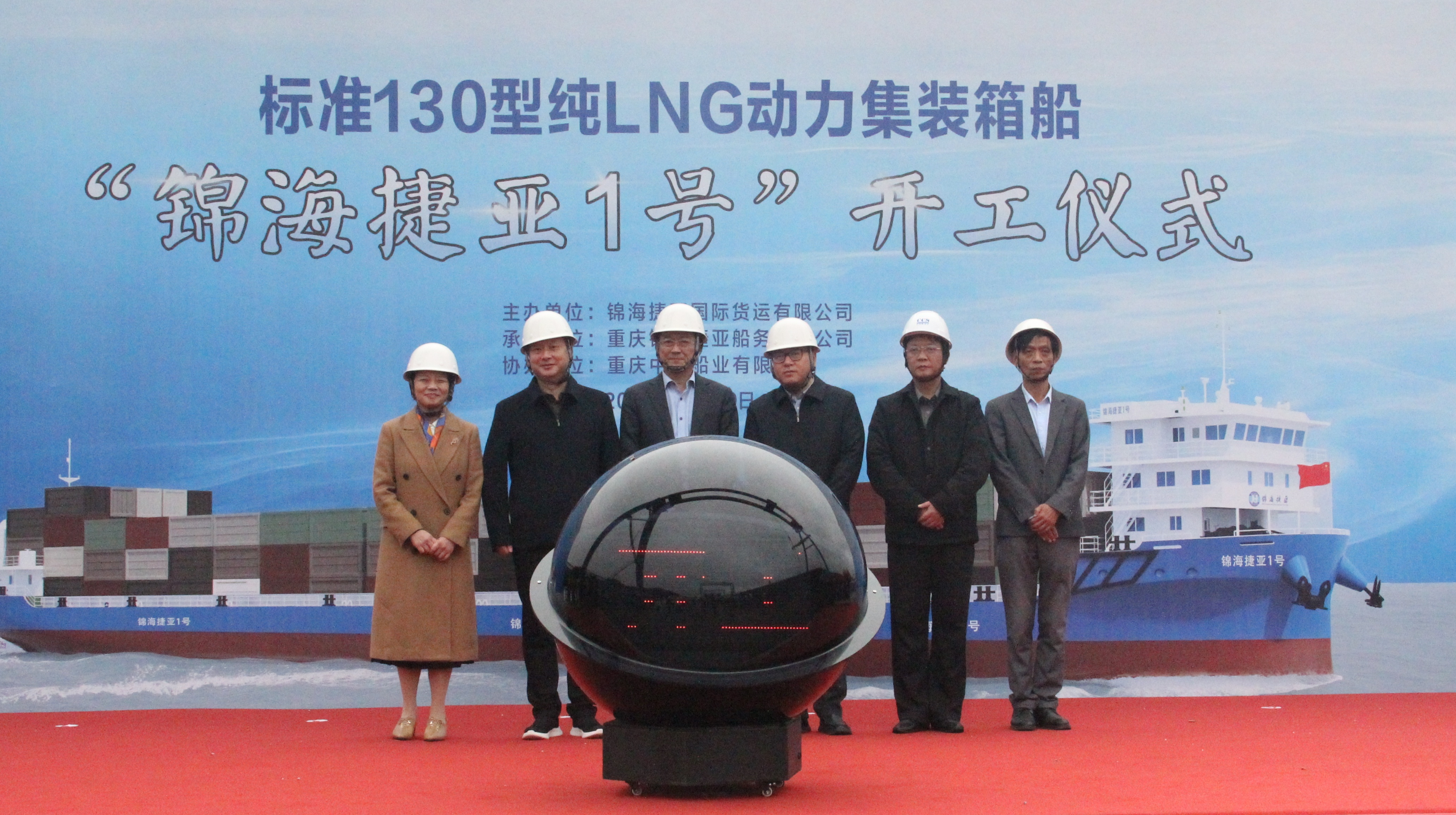 11月10日上午10:58分,“锦海捷亚1号”在中江船业公司正式开工建造。上海锦江在线股份锦海捷亚货运副总裁、董事长丁田,江北区交通运输委副主任杨晓鹏,中国船级社重庆分社总经理涂建川,重庆轮船(集团)有限公司党委委员、副总经理袁伟,锦海捷亚船务总经理潘小华出席典礼。