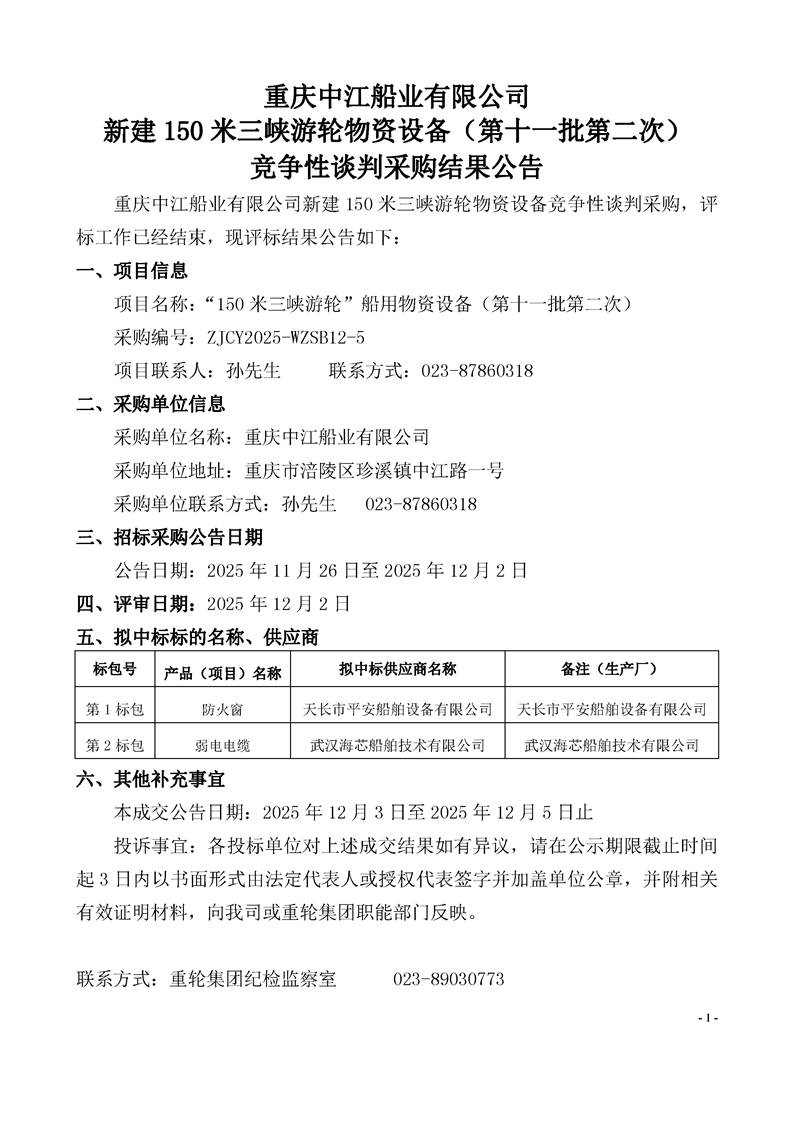 中江船业新建150米三峡游轮物资设备(第十一批第二次)竞争性谈判采购结果公告(采购编号:ZJCY2025-WZSB12-5)