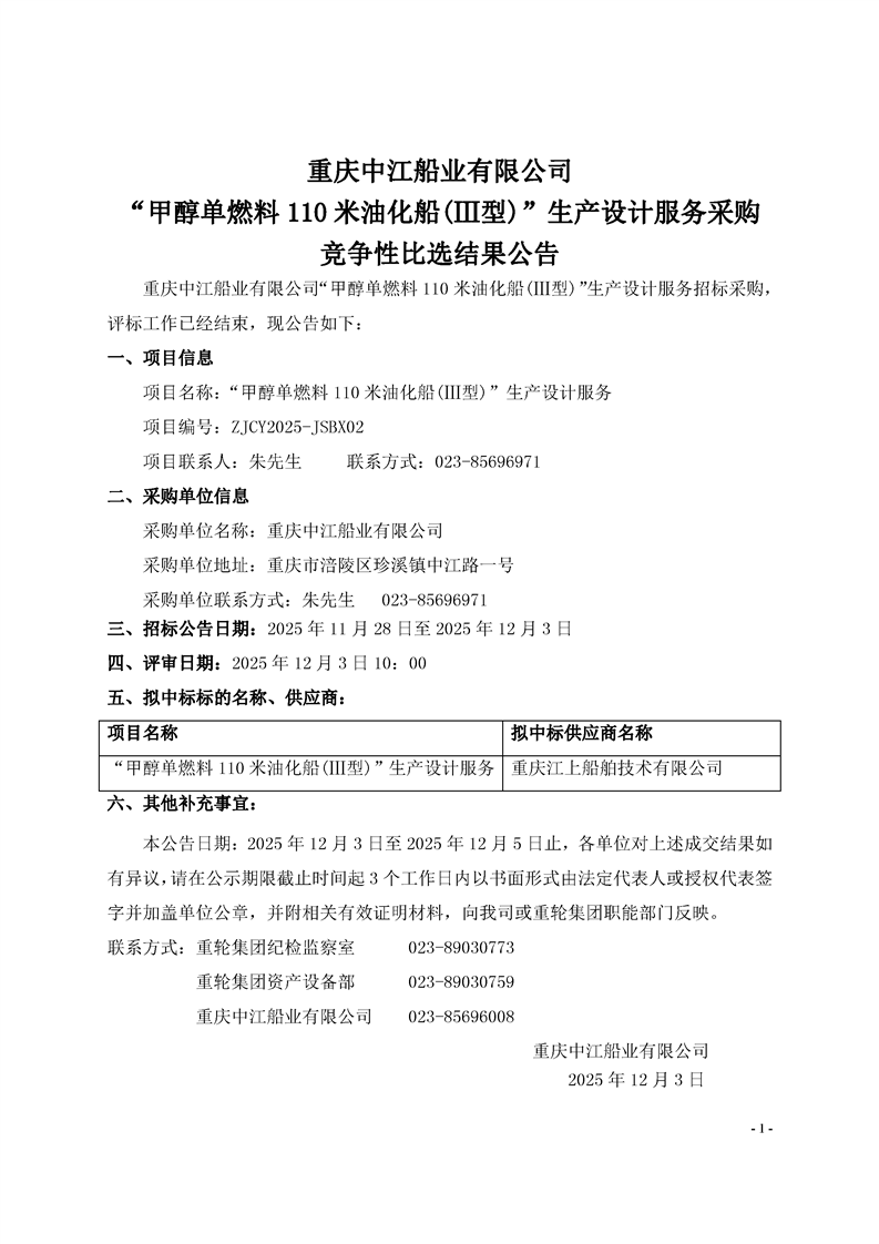 中江船业 “甲醇单燃料110米油化船Ⅲ型”生产设计服务采购竞争性比选结果公告