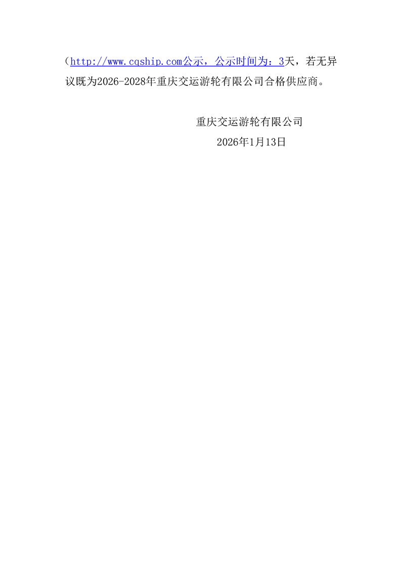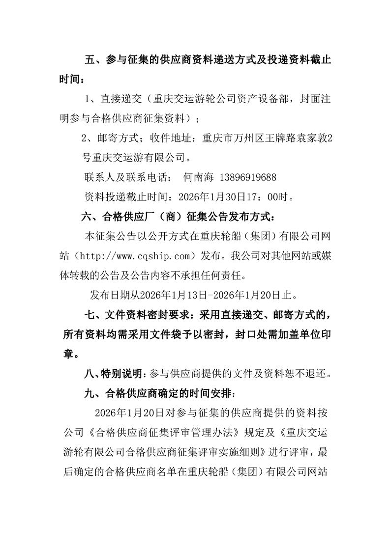 重庆交运游轮有限公司2026-2028年度合格供应商征集公告