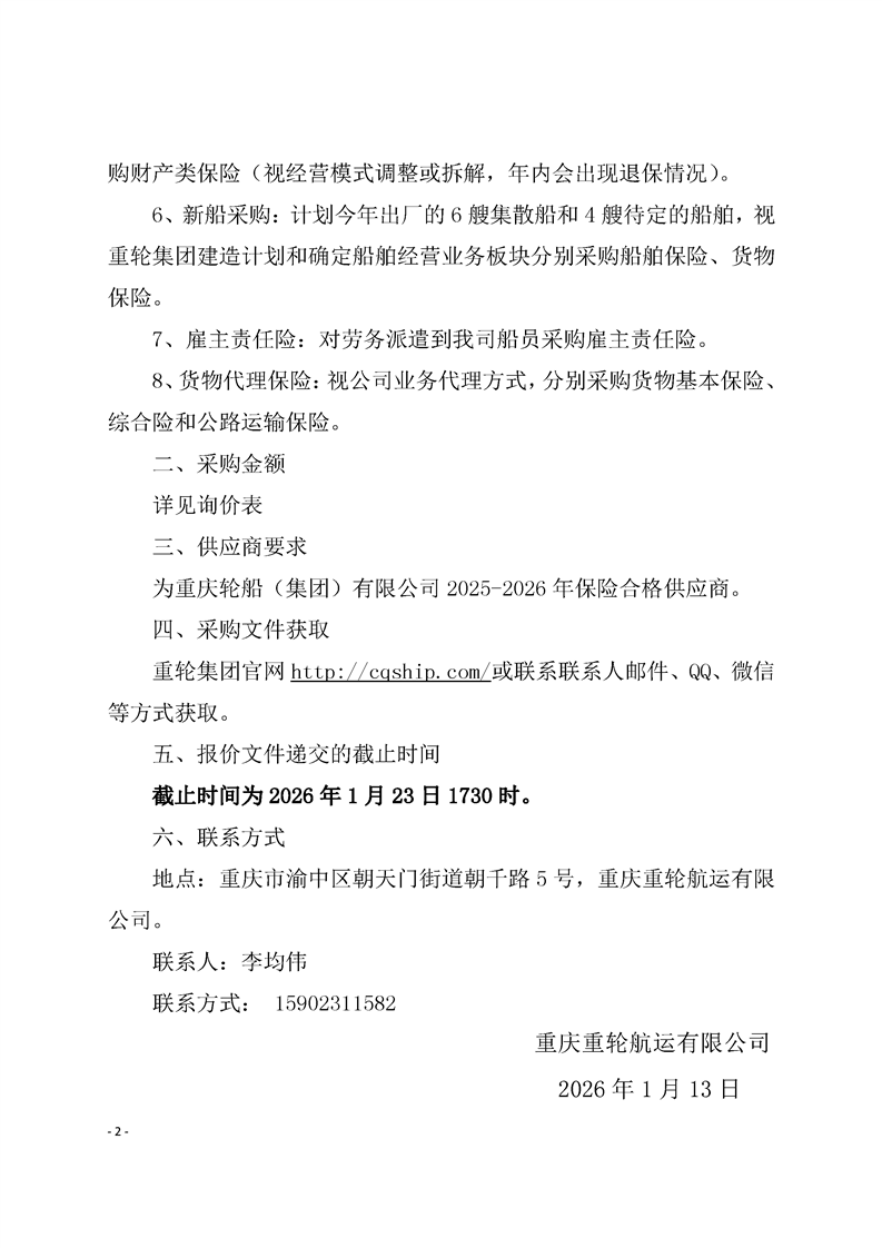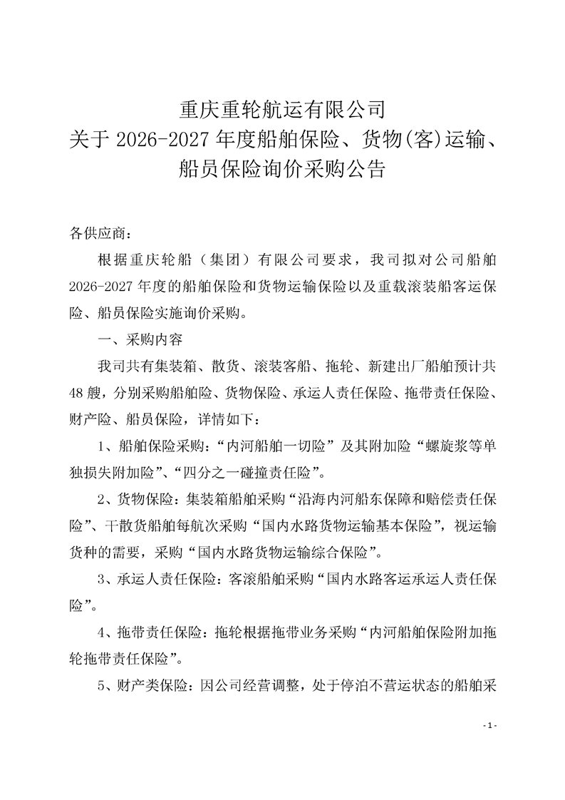 重庆重轮航运有限公司关于2026-2027年度船舶保险、货物客运输、船员保险询价采购公告