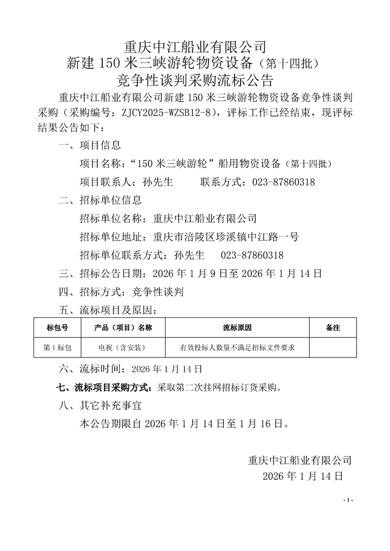 中江船业新建150米三峡游轮物资设备(第十四批) 竞争性谈判采购流标公告(采购编号:ZJCY2025-WZSB12-8)