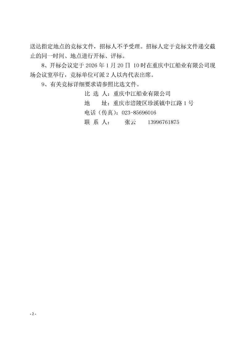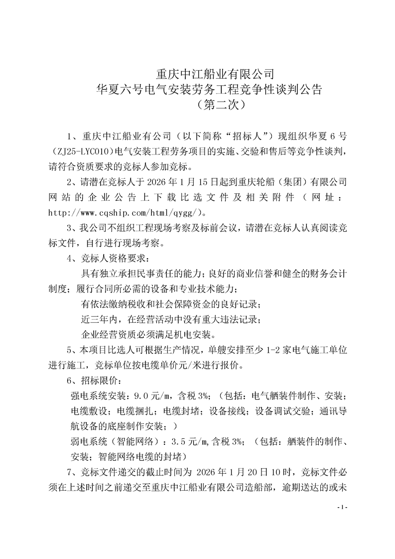 重庆中江船业有限公司华夏六号电气安装劳务工程竞争性谈判公告 (第二次)